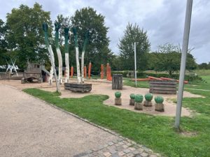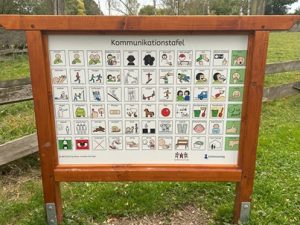 野外活動施設では、だれもが楽しめるようにと、車いすに乗ったまま遊べる遊具があったり、コミュニケーションボードで絵を通して気持ちを伝えることができるようになっていたりという工夫も見られました。